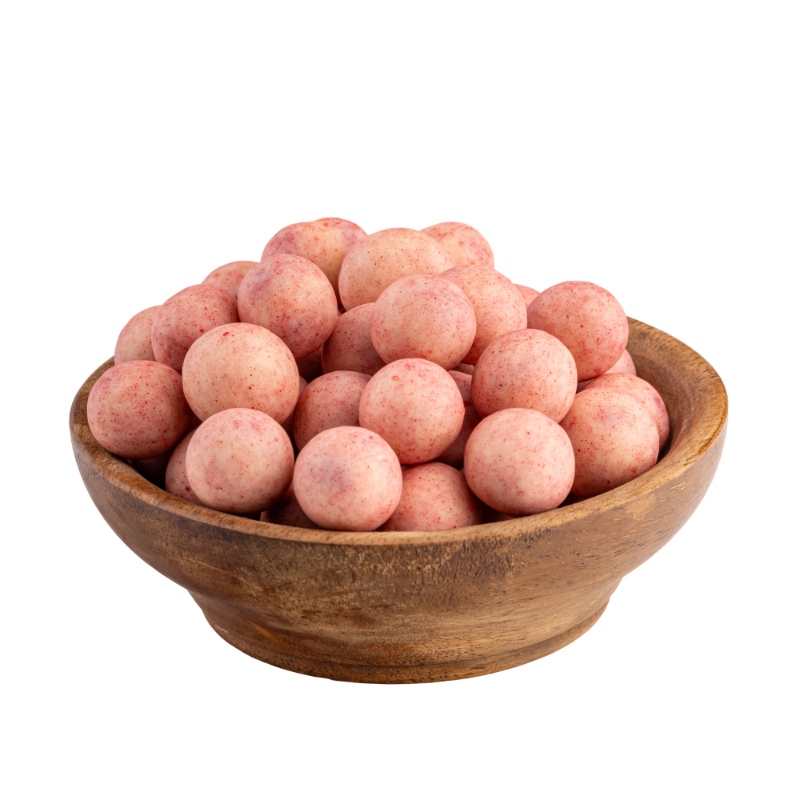 Alune de pădure, culese cu grijă, coapte la o temperatura medie, învelite cu grijă în ciocolată albă si pudrate cu pudra de zmeură liofilizată organică.